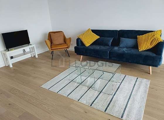 This apartment consists of a beautiful living room with wooden floor and its double-glazed windows. This very quiet living room is furnished and equipped for a comfortable stay: tv, sofa, 1 armchair(s), dining table, coffee table, 1 chair(s), airer, tv stand, bin, set of tables, carpet.