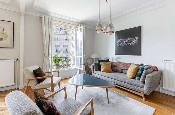Living roomThis apartment consists of a fabulous living room with wooden floor and its windows. This very quiet living room is furnished and equipped for a comfortable stay: sofa, 1 armchair(s), dining table, coffee table, shelves, 1 chair(s).