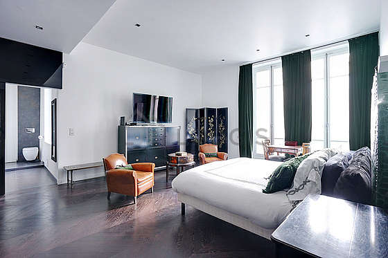 This apartment is equipped with a bathroom. This bathroom is furnished with all the equipment you need for a comfortable stay: bath towels, bath tub, hair-dryer, airer, sink, mirror, towel rack, bin, towel drying radiator. The toilets are located in the bathroom.