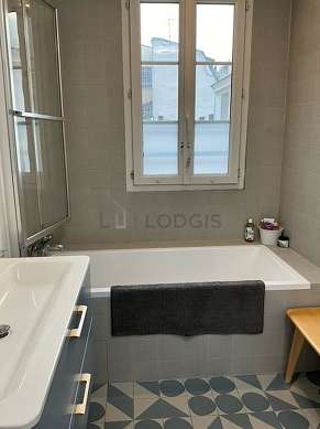 This apartment is equipped with a bathroom. This bathroom is furnished with all the equipment you need for a comfortable stay: cupboard, bath tub, sink. The toilets are separated from the bathroom and located in an independant room.