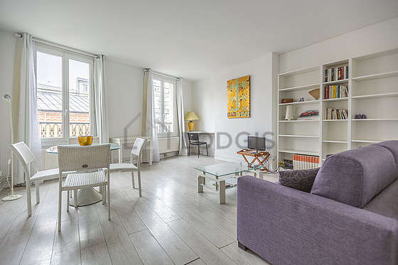 Living roomThis apartment consists of a fabulous living room with wooden floor and its windows. This very quiet living room is furnished and equipped for a comfortable stay: tv, sofa, dining table, coffee table, bookcase, storage space, 1 chair(s).