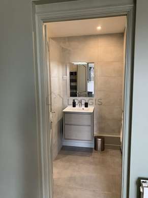 This apartment is equipped with a bathroom. This bathroom is furnished with all the equipment you need for a comfortable stay: bath towels, closet, cupboard, separate shower, hair-dryer, sink, bin, towel drying radiator, ventilator. The toilets are located in the bathroom.