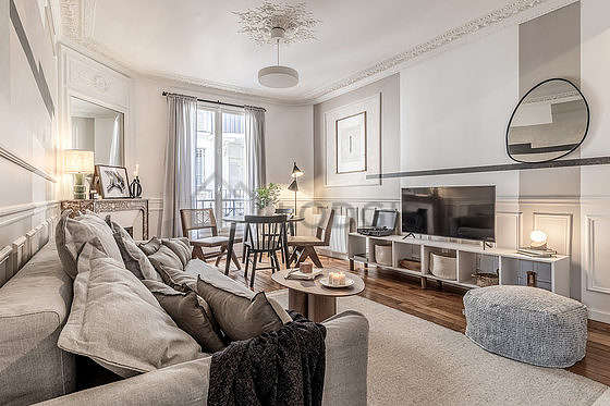 Living roomThis apartment consists of a living room its windows. This living room is furnished and equipped for a comfortable stay: tv, sofa, dining table, 1 chair(s), carpet.