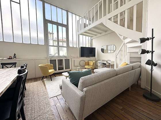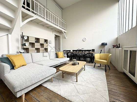 Living roomThis duplex consists of a wonderful living room with wooden floor and its double-glazed windows. This quiet living room is furnished and equipped for a comfortable stay: tv, sofa, 1 armchair(s), dining table, coffee table, desk, cupboard, 1 chair(s), tv stand.