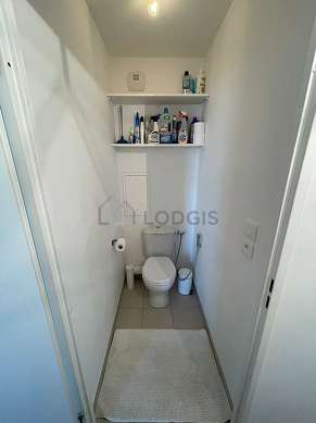 This apartment is equipped with a bathroom. This bathroom is furnished with all the equipment you need for a comfortable stay: shelves, bath tub, sink, mirror, towel rack, towel drying radiator. The toilets are separated from the bathroom and located in an independant room.