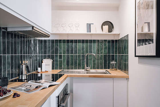 This apartment consists of kitchen and all the necessary equipment for your daily life: hob, refrigerator, oven, cupboard, crockery.