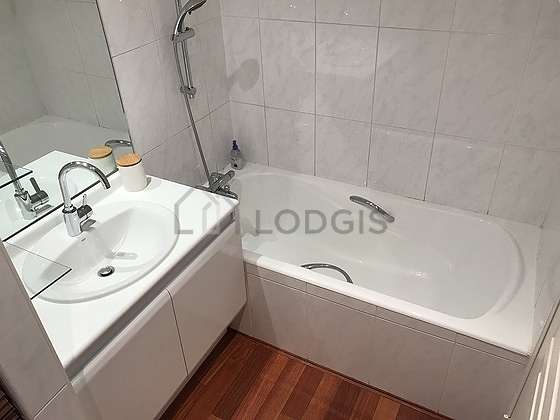 This apartment is equipped with a bathroom. This bathroom is furnished with all the equipment you need for a comfortable stay: bath towels, shelves, cupboard, bath tub, hair-dryer, sink, mirror, towel rack, towel drying radiator, painting. The toilets are separated from the bathroom and located in an independant room.