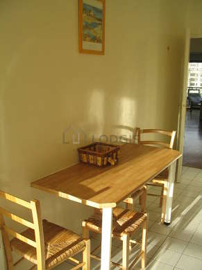This apartment consists of a pleasant living room with wooden floor and its windows with balcony. This very quiet living room is furnished and equipped for a comfortable stay: tv, 3 armchair(s), dining table, coffee table, shelves, cupboard, 4 chair(s)1 sofabed(s) of 140cm.