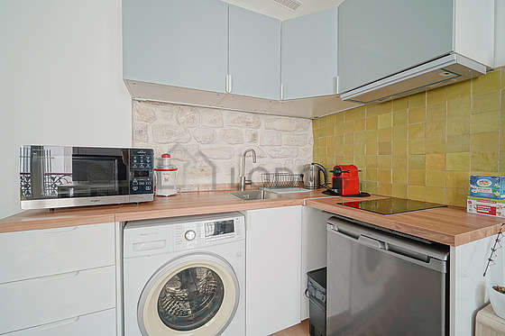 This apartment consists of kitchen and all the essential equipment for your daily life: hob, refrigerator, freezer, oven, microwave oven, extractor hood, toaster, coffee-maker, shelves, crockery, bin.