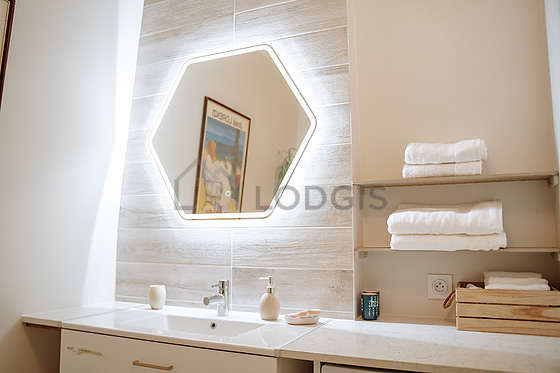 This apartment is equipped with a great bathroom and very bright. This bathroom is furnished with all the equipment you need for a comfortable stay: bath towels, shelves, storage space, separate shower, hair-dryer, airer, sink, mirror, towel rack, bin, pouffe, towel drying radiator, painting, carpet, vase, ventilator. The toilets are located in the bathroom.