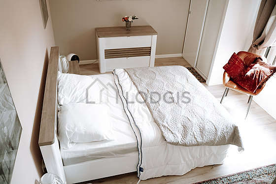 This apartment consists of a beautiful living room with wooden floor and its double-glazed windows. This very quiet living room is furnished and equipped for a comfortable stay: tv, sofa, 1 armchair(s), dining table, coffee table, wardrobe, storage space, cupboard, 1 chair(s), tv stand, mirror, pouffe, painting, carpet, vase.