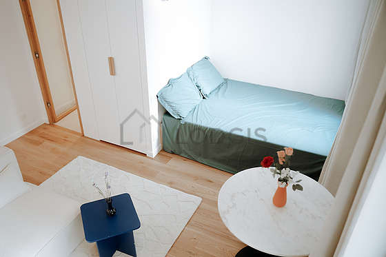 Living roomThis apartment consists of a beautiful living room with wooden floor and its windows. This very quiet living room is furnished and equipped for a comfortable stay: linen, quilt, sofa, dining table, coffee table, stool.