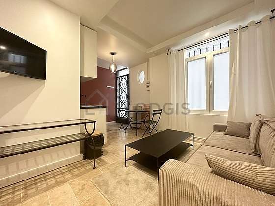 Living roomThis apartment consists of a pleasant living room with tile floor and its windows and view on road. This quiet living room is furnished and equipped for a comfortable stay: tv, sofa, coffee table, 1 chair(s).