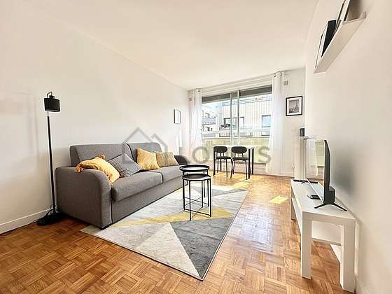 Living roomThis apartment consists of a attractive living room with wooden floor and its windows and view on road. This quiet living room is furnished and equipped for a comfortable stay: tv, linen, quilt, dining table, coffee table, desk, 1 chair(s)1 sofabed(s) of 140cm.