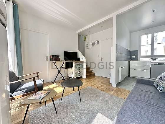 Living roomThis apartment consists of a attractive living room with wooden floor and its double-glazed windows and view on road. This quiet living room is furnished and equipped for a comfortable stay: tv, sofa, 1 armchair(s), coffee table, desk, cupboard, 1 chair(s).