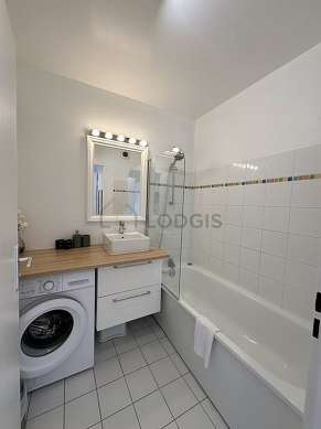 This apartment is equipped with a bathroom. This bathroom is furnished with all the equipment you need for a comfortable stay: cupboard, bath tub, sink. The toilets are separated from the bathroom and located in an independant room.