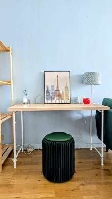 This apartment consists of a beautiful living room with wooden floor and its windows. This very quiet living room is furnished and equipped for a comfortable stay: tv, sofa, 1 armchair(s), dining table, coffee table, desk, shelves, 1 chair(s), stool.