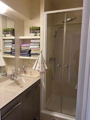 This apartment is equipped with a bathroom. This bathroom is furnished with all the equipment you need for a comfortable stay: shelves, separate shower, sink. The toilets are separated from the bathroom and located in an independant room.