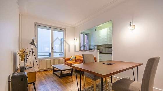 Living roomThis apartment consists of a pleasant living room with wooden floor and its windows. This quiet living room is furnished and equipped for a comfortable stay: tv, sofa, dining table, coffee table, 1 chair(s).