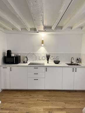 Living roomThis apartment consists of a charming living room with wooden floor and its windows and view on courtyard. This quiet living room is furnished and equipped for a comfortable stay: tv, linen, quilt, 1 armchair(s), coffee table, wardrobe, hair-dryer1 bed(s) of 160cm.