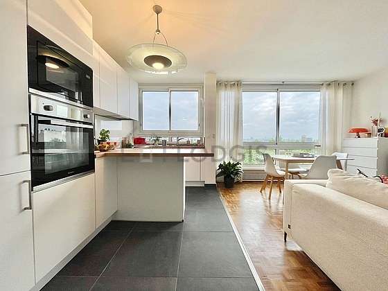 Living roomThis apartment consists of a wonderful living room with wooden floor and its double-glazed windows. This very quiet living room is furnished and equipped for a comfortable stay: tv, sofa, dining table, coffee table, storage space, tv stand, curtains, carpet.