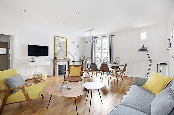 Living roomThis apartment consists of a living room with wooden floor and its windows. This living room is furnished and equipped for a comfortable stay: tv, sofa, 2 armchair(s), dining table, coffee table, fireplace, 6 chair(s), floor lamp, tv stand, mirror.