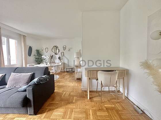 Living roomThis apartment consists of a fabulous living room with wooden floor and its double-glazed windows with balcony and view on road. This very quiet living room is furnished and equipped for a comfortable stay: dining table, desk, 1 chair(s)1 sofabed(s) of 140cm.