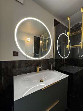 This apartment is equipped with a bathroom. This bathroom is furnished with all the equipment you need for a comfortable stay: bath towels, storage space, separate shower, airer, sink, ventilator. The toilets are separated from the bathroom and located in an independant room.