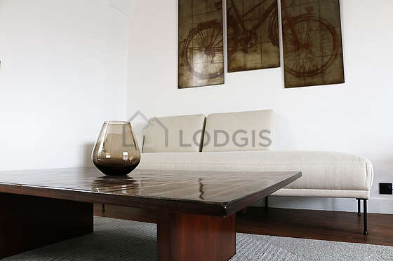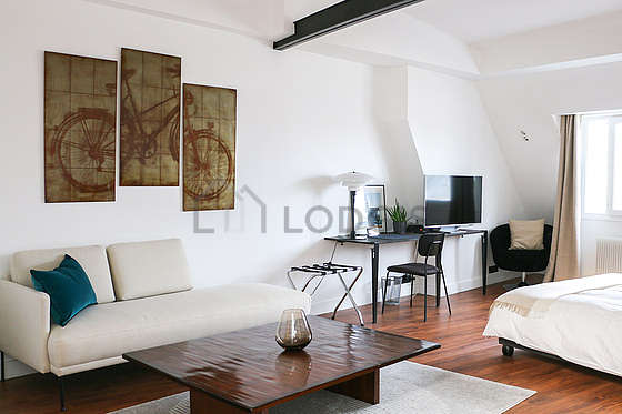 Living roomThis apartment consists of a pleasant living room with wooden floor and its windows. This quiet living room is furnished and equipped for a comfortable stay: tv, sofa, 1 armchair(s), dining table, coffee table, desk, bookcase, 1 chair(s).