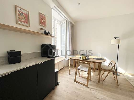 Living roomThis apartment consists of a fabulous living room with wooden floor and its windows. This very quiet living room is furnished and equipped for a comfortable stay: iron, vacuum cleaner, sofa, dining table, coffee table, 4 chair(s), floor lamp, blinds, carpet1 sofabed(s) of 140cm.