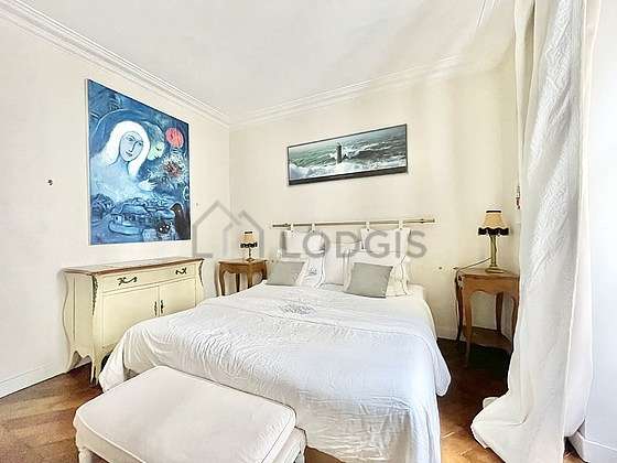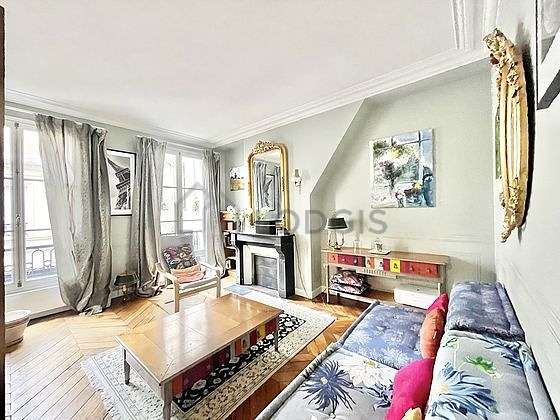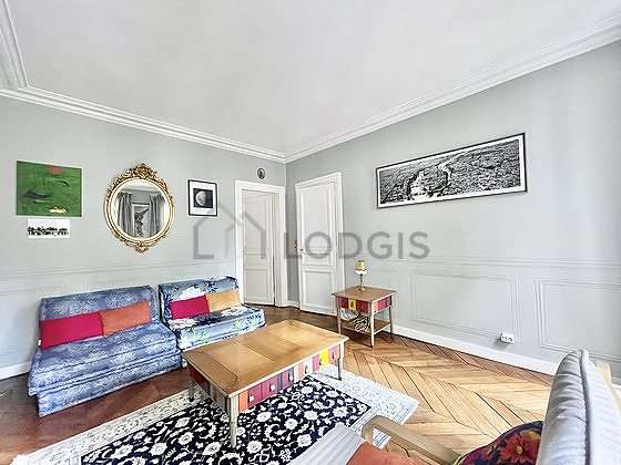 Living roomThis apartment consists of a living room with wooden floor and its windows. This living room is furnished and equipped for a comfortable stay: sofa, coffee table, storage space, mirror, curtains.