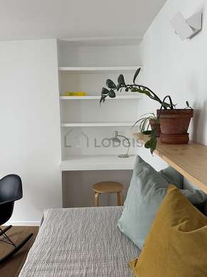 Living roomThis apartment consists of a attractive living room with wooden floor view on courtyard. This quiet living room is furnished and equipped for a comfortable stay: tv, 1 armchair(s), dining table, coffee table, desk, wardrobe, bookcase, shelves, cupboard, 2 chair(s), curtains1 sofabed(s) of 140cm.