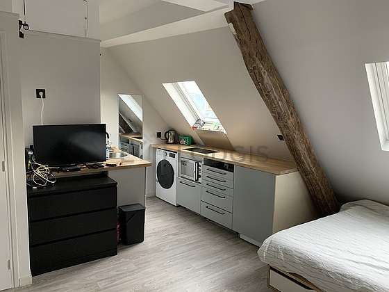Living roomThis apartment consists of a living room its windows. This living room is furnished and equipped for a comfortable stay: tv, quilt, sofa, bookcase, storage space, 1 chair(s), bedside table, tv stand, coat stand.