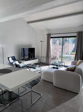 This house consists of a living room with tile floor and its double-glazed windows. This living room is furnished and equipped for a comfortable stay: tv, sofa, 1 armchair(s), dining table, coffee table, 1 chair(s), floor lamp, vase.