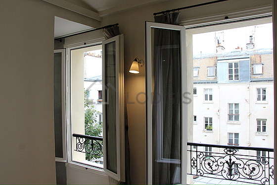 This apartment consists of a living room its windows. This living room is furnished and equipped for a comfortable stay.