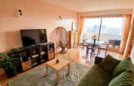 Living roomThis apartment consists of a attractive living room with wooden floor and its windows. This quiet living room is furnished and equipped for a comfortable stay: tv, sofa, 1 armchair(s), dining table, coffee table, 2 chair(s).