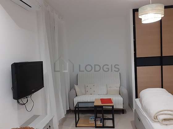 Living roomThis house consists of a living room with tile floor and its double-glazed windows. This living room is furnished and equipped for a comfortable stay: tv, quilt, iron, vacuum cleaner, sofa, wardrobe, cupboard, bedside table, airer, mirror, set of tables.