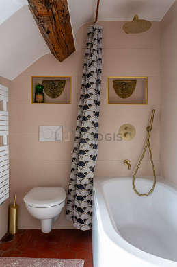 This apartment is equipped with a bathroom. This bathroom is furnished with all the equipment you need for a comfortable stay: bath towels, bath tub, hair-dryer, sink, towel rack, bin, towel drying radiator, carpet, ventilator. The toilets are located in the bathroom.