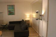 This apartment consists of a living room its windows. This living room is furnished and equipped for a comfortable stay: tv, sofa, coffee table, shelves.