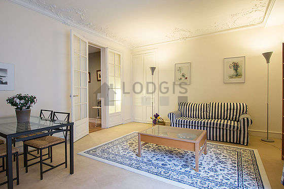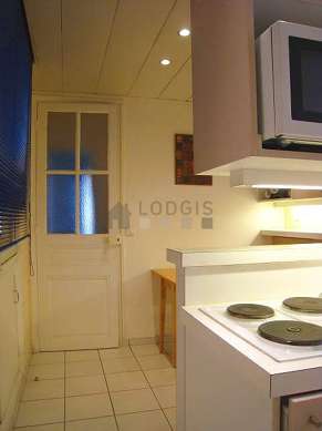 This apartment consists of a attractive living room with a carpeting floor view on courtyard. This very quiet living room is furnished and equipped for a comfortable stay: tv, 1 armchair(s), dining table, coffee table, bookcase, shelves, 4 chair(s)1 sofabed(s) of 140cm.