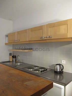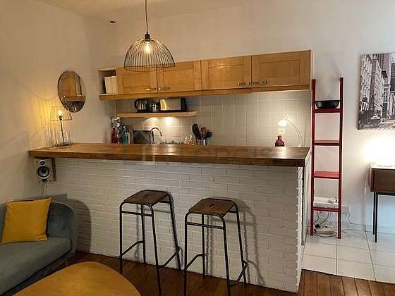 This apartment consists of a charming living room with wooden floor and its double-glazed windows and view on courtyard. This very quiet living room is furnished and equipped for a comfortable stay: linen, quilt, 2 armchair(s), coffee table, desk, 3 chair(s)1 sofabed(s) of 140cm.
