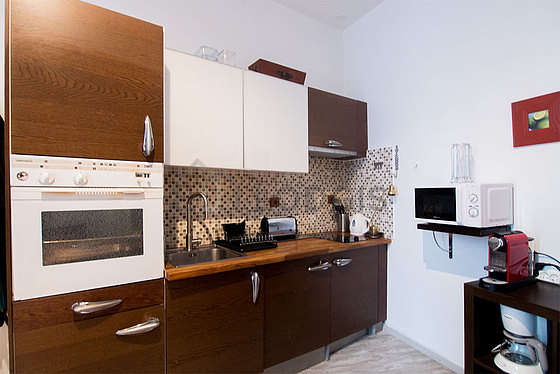 This apartment consists of beautiful kitchen with wooden floor and all the essential equipment for your daily life: hob, refrigerator, oven, microwave oven, freezer, extractor hood, toaster, kettle, coffee-maker, cupboard, crockery.