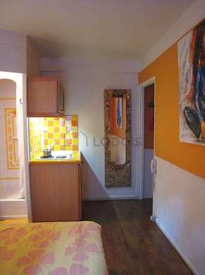 Living roomThis apartment consists of a wonderful living room with wooden floor and its double-glazed windows and view on road. This very quiet living room is furnished and equipped for a comfortable stay: linen, dining table, shelves, 2 chair(s), bedside table1 bed(s) of 140cm.