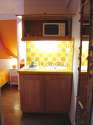 This apartment consists of great kitchen with wooden floor and all the essential equipment for your daily life: hob, refrigerator, microwave oven, kettle, cupboard, crockery.