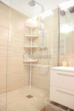 This apartment is equipped with a great bathroom. This bathroom is furnished with all the equipment you need for a comfortable stay: shelves, cupboard, separate shower, sink. The toilets are separated from the bathroom and located in an independant room.