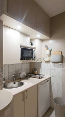 This duplex consists of beautiful kitchen with tile floor and all the necessary equipment for your daily life: hob, refrigerator, combined microwave oven, freezer, extractor hood, kettle, coffee-maker, shelves, cupboard, crockery, stool, bar.