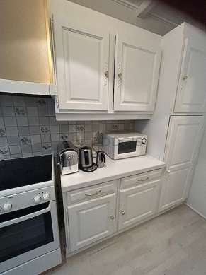 This apartment consists of beautiful kitchen and all the necessary equipment for your daily life: hob, refrigerator, oven, combined microwave oven, freezer, extractor hood, toaster, kettle, coffee-maker, shelves, cupboard, crockery, wooden beams, stool.