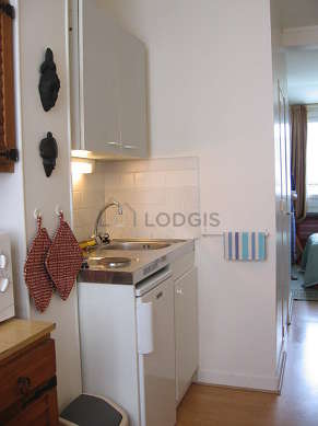 This apartment consists of beautiful kitchen with wooden floor and all the essential equipment for your daily life: hob, refrigerator, microwave oven, freezer, toaster, coffee-maker, dining table, cupboard, crockery, 2 chair(s).