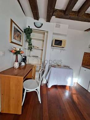 This apartment consists of a pleasant living room with wooden floor and its windows with balcony and view on courtyard. This very quiet living room is furnished and equipped for a comfortable stay: tv, linen, desk, wardrobe, shelves, closet, cupboard, 1 chair(s)1 sofabed(s) of 140cm.