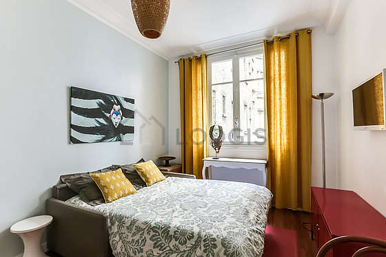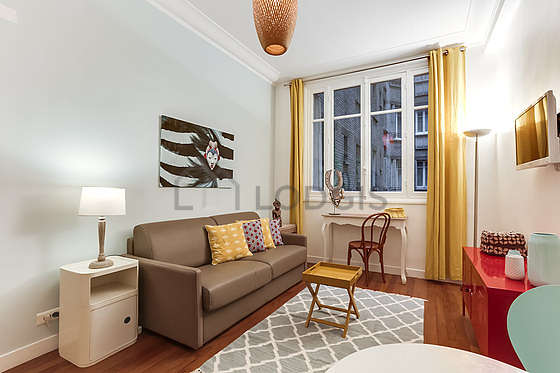 Living roomThis apartment consists of a pleasant living room with wooden floor and its windows and view on courtyard. This very quiet living room is furnished and equipped for a comfortable stay: tv, linen, quilt, coffee table, wardrobe, shelves, cupboard, 2 chair(s), bedside table1 sofabed(s) of 140cm.